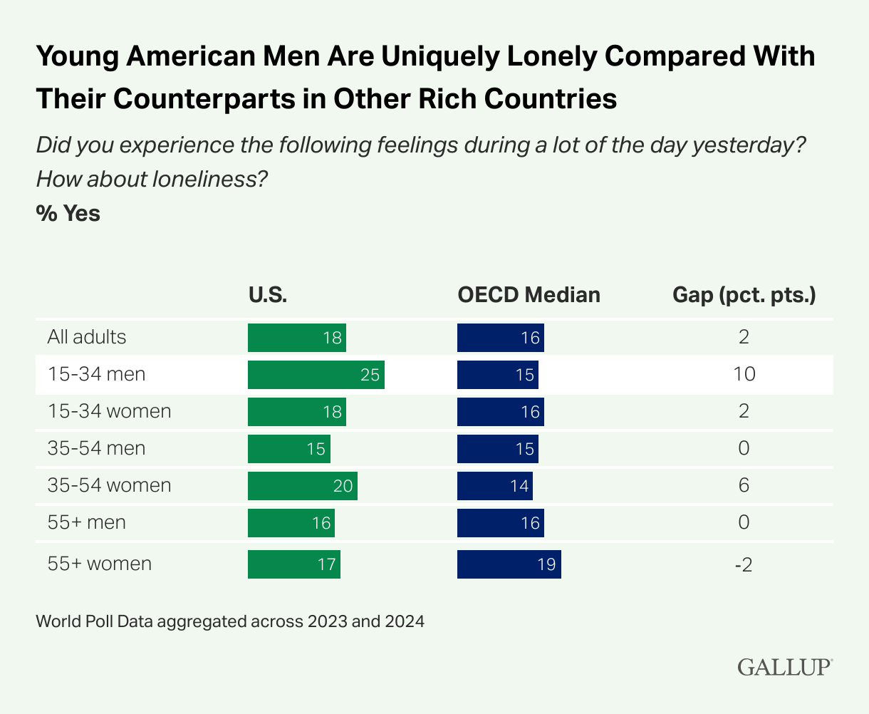 Evidence of this includes; a 2025 NHS survey in the UK showing one in four young people in England (ages 16–24) now live with a common mental health condition, including anxiety, depression, panic disorder, phobias, and OCD. This is a rise from 18.9 percent in 2014 to 25.8 percent in 2024. In the USA, a Gallup poll from 2023–24 reports that 25 percent of young American men under 35 experience persistent loneliness, exceeding the average in other wealthy nations…